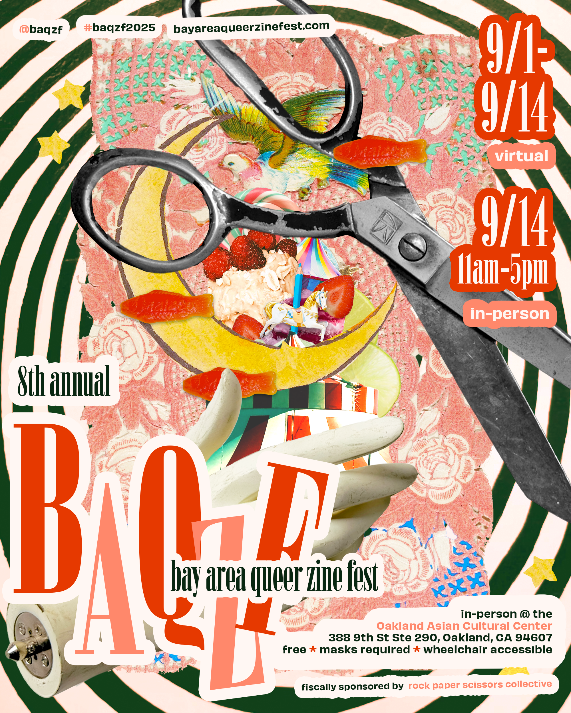 Oakland, CA– Bay Area Queer Zine Fest (BAQZF) is pleased to announce its return for the 8th annual in-person event in addition to a two week-long virtual fest. This year’s hybrid event will host online vendors on the BAQZF website from September 1st through September 14th, culminating with an in-person event on Sunday, September 14th, featuring local and national exhibitors at the Oakland Asian Cultural Center on 388 9th St, Ste 290.